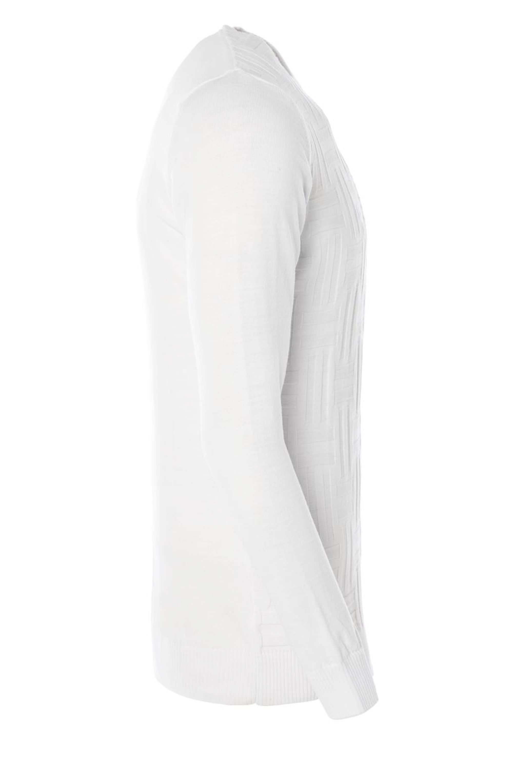 Maglia leggera bianca da uomo con un motivo decorativo sobrio sulla superficie.