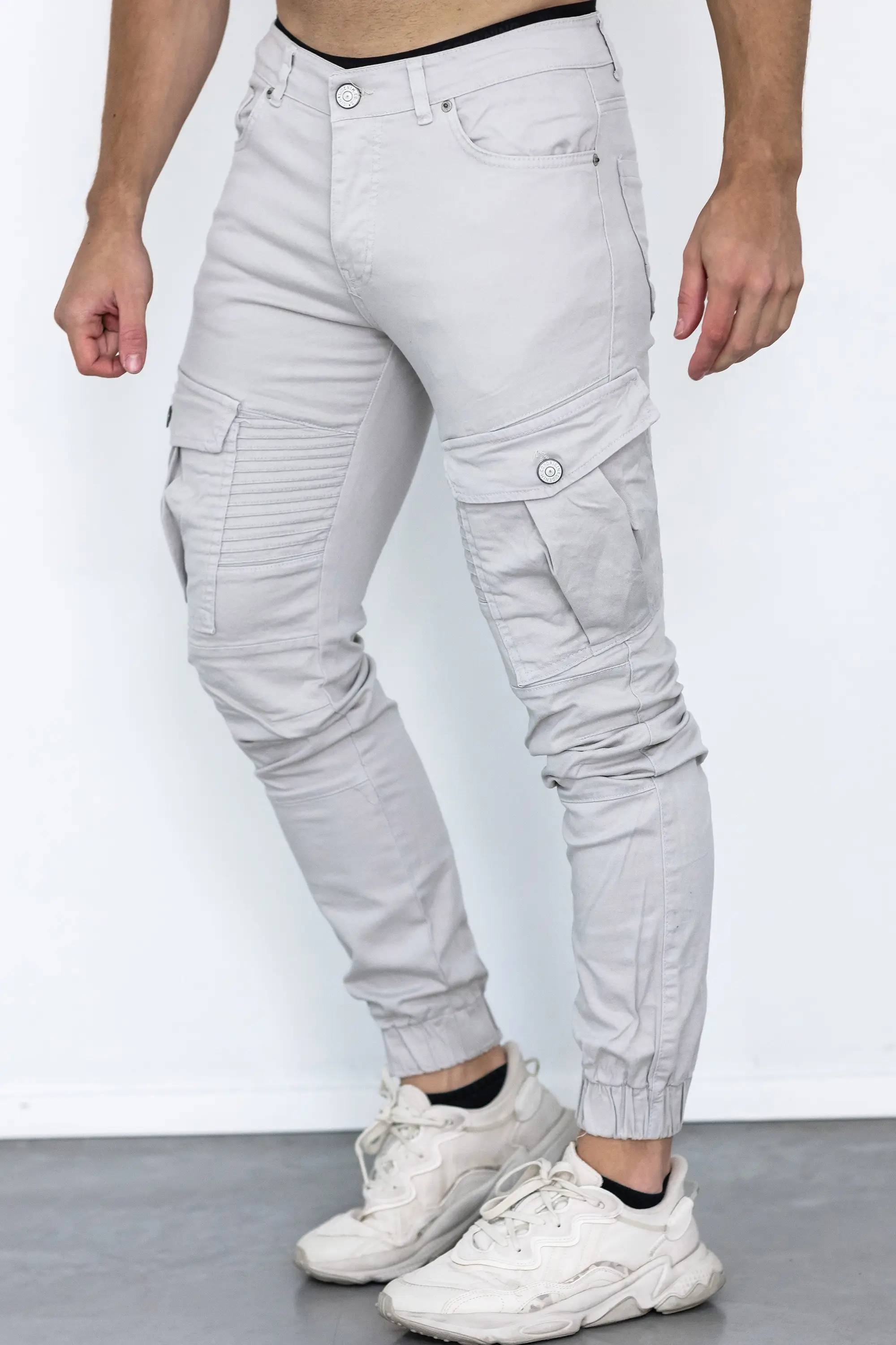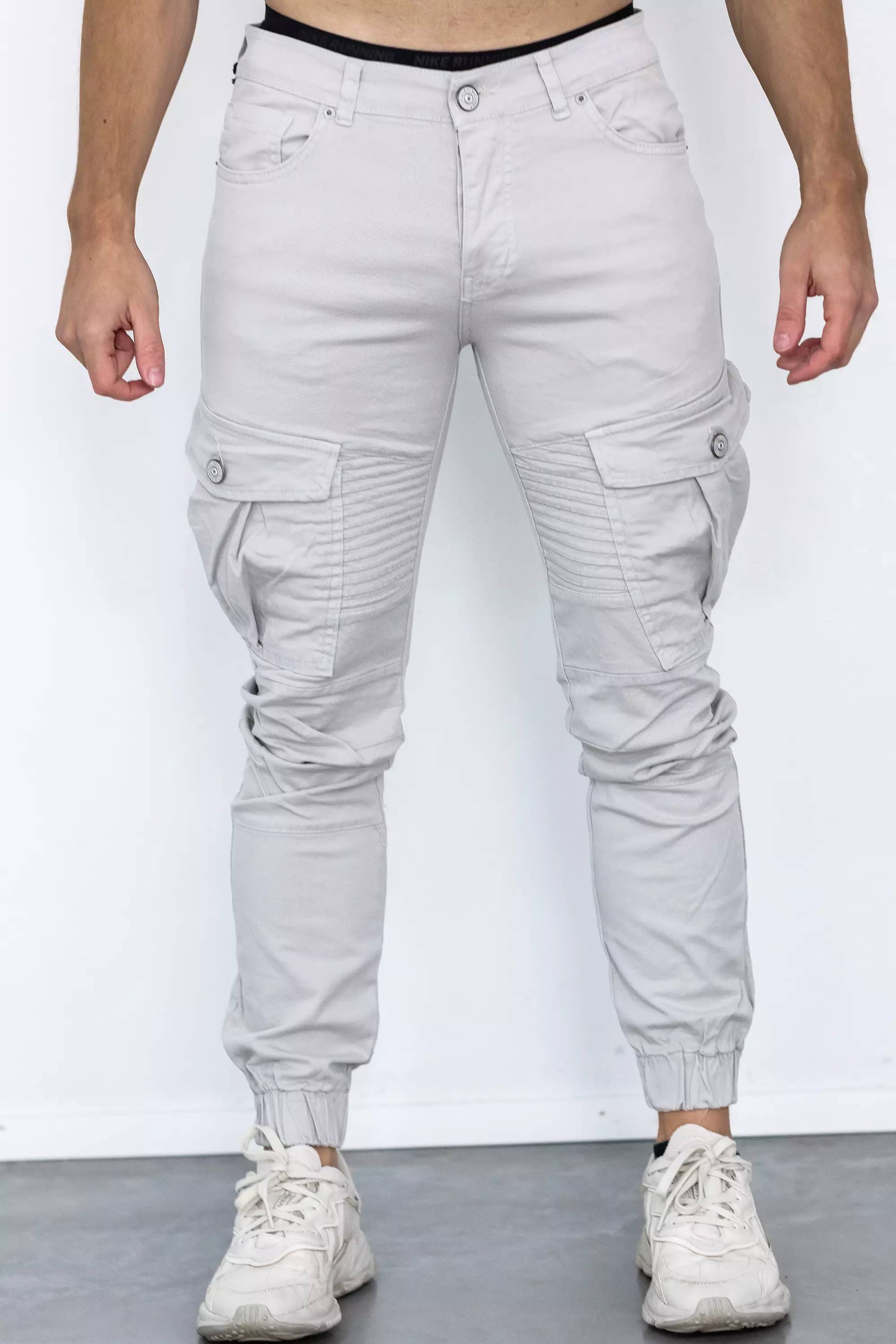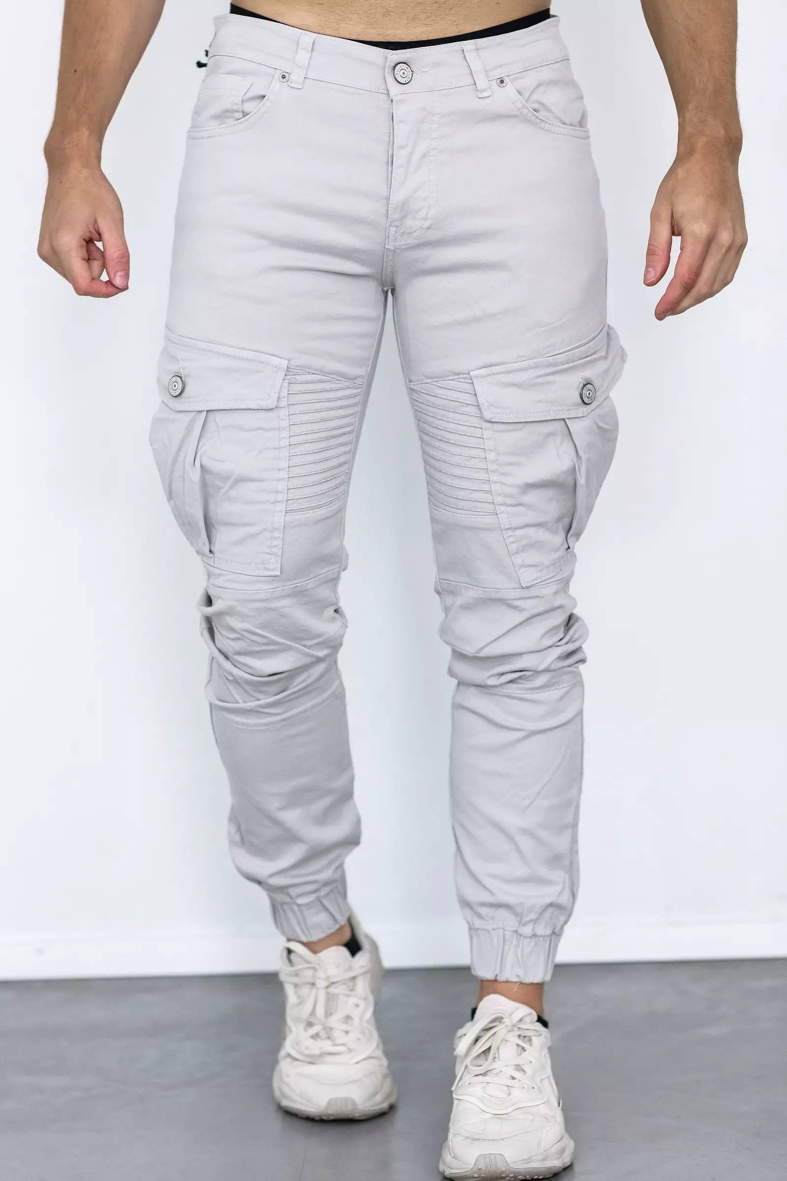 Pantalone JERONE grigio chiaro. Materiale confortevole e flessibile. Molle in libbre. Chiusura con bottoni sul retro. Tasche sulla coscia, due tasche anteriori e due tasche posteriori. Imbottitura biker sul davanti. Lunghezza L32.