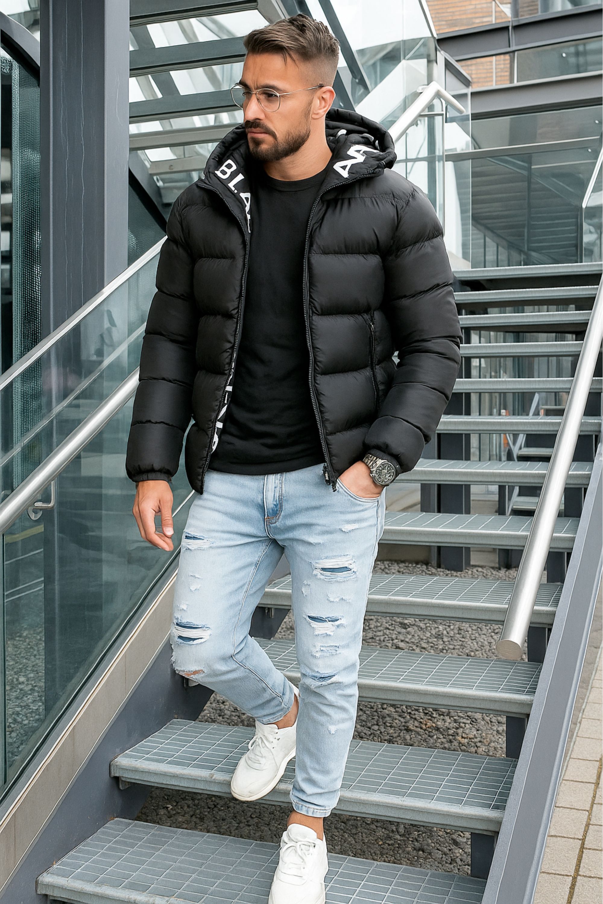 - Percorso del prodotto Prima pagina Giacche da uomoGiacche invernali da uomo Giacca invernale nera calda con stampa di testo JERONE