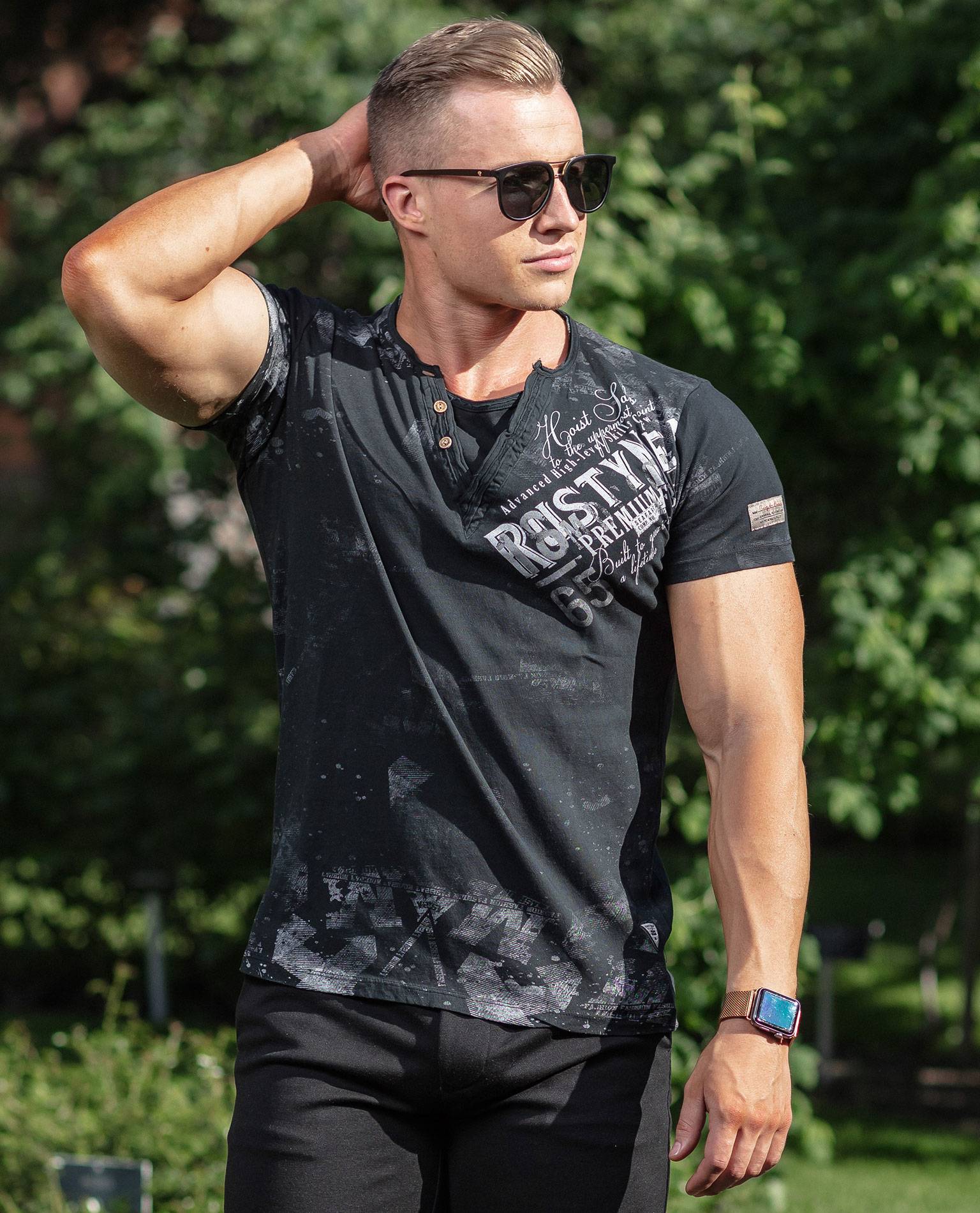 T-shirt nera RUSTY NEAL. Stampa ordinata sul davanti e sulle maniche. Stampa logo sulla manica. Bottoni decorativi sullo scollo.