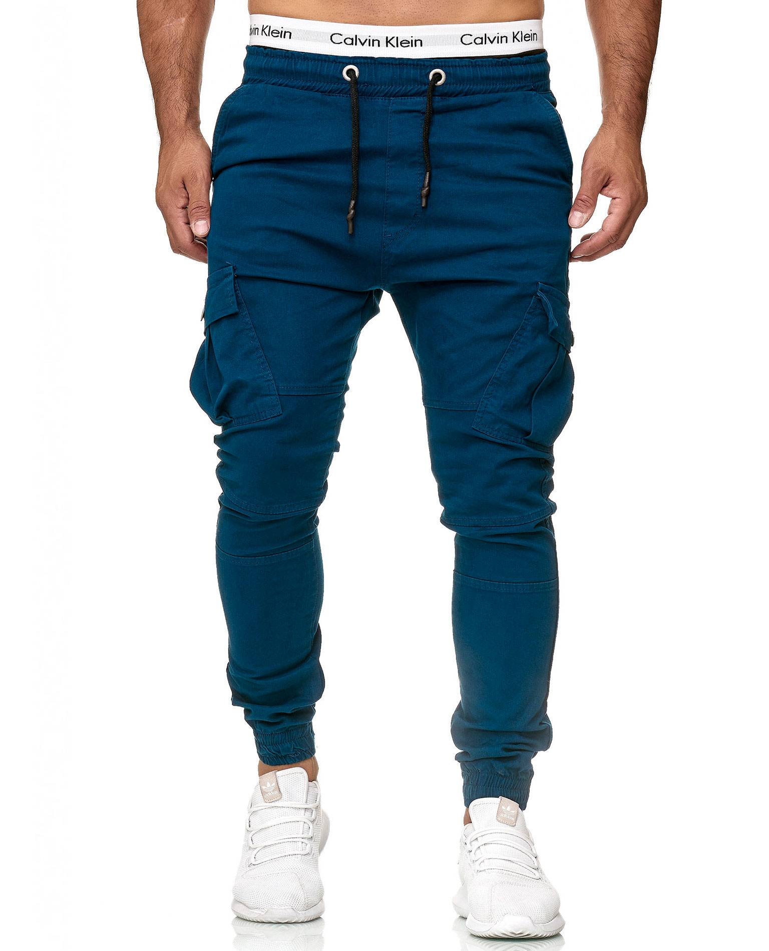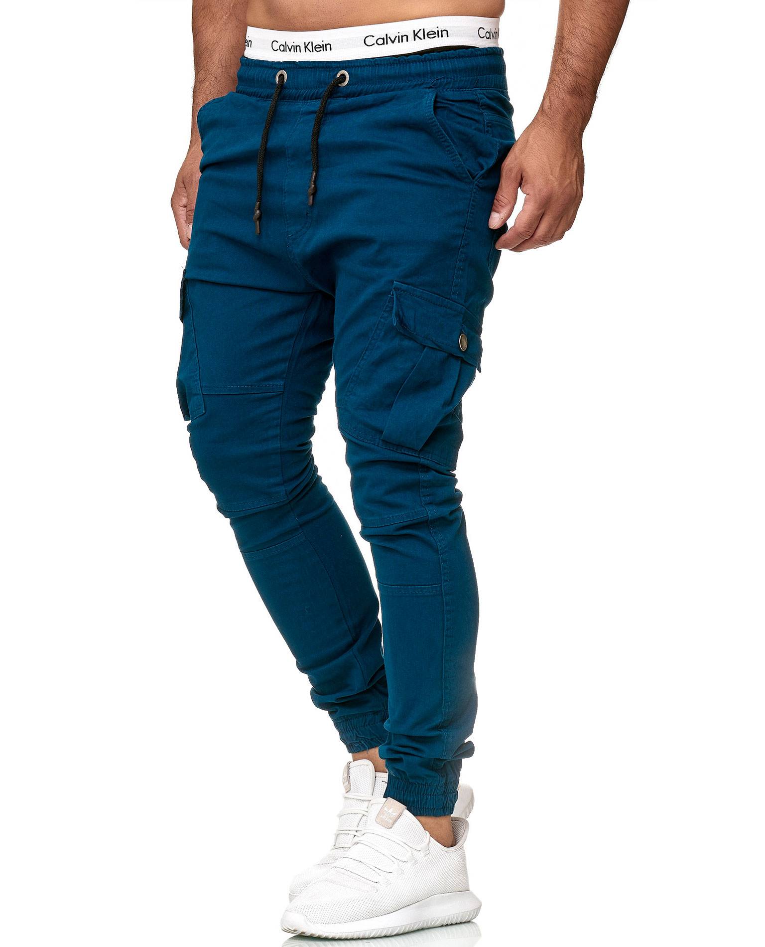 JERONE pantalone blu scuro. Materiale comodo e flessibile. Elastici ai polsini e in vita, con coulisse aggiuntiva. Cerniera sul retro. Tasche sulla coscia, due tasche anteriori e due posteriori. Lunghezza L32.