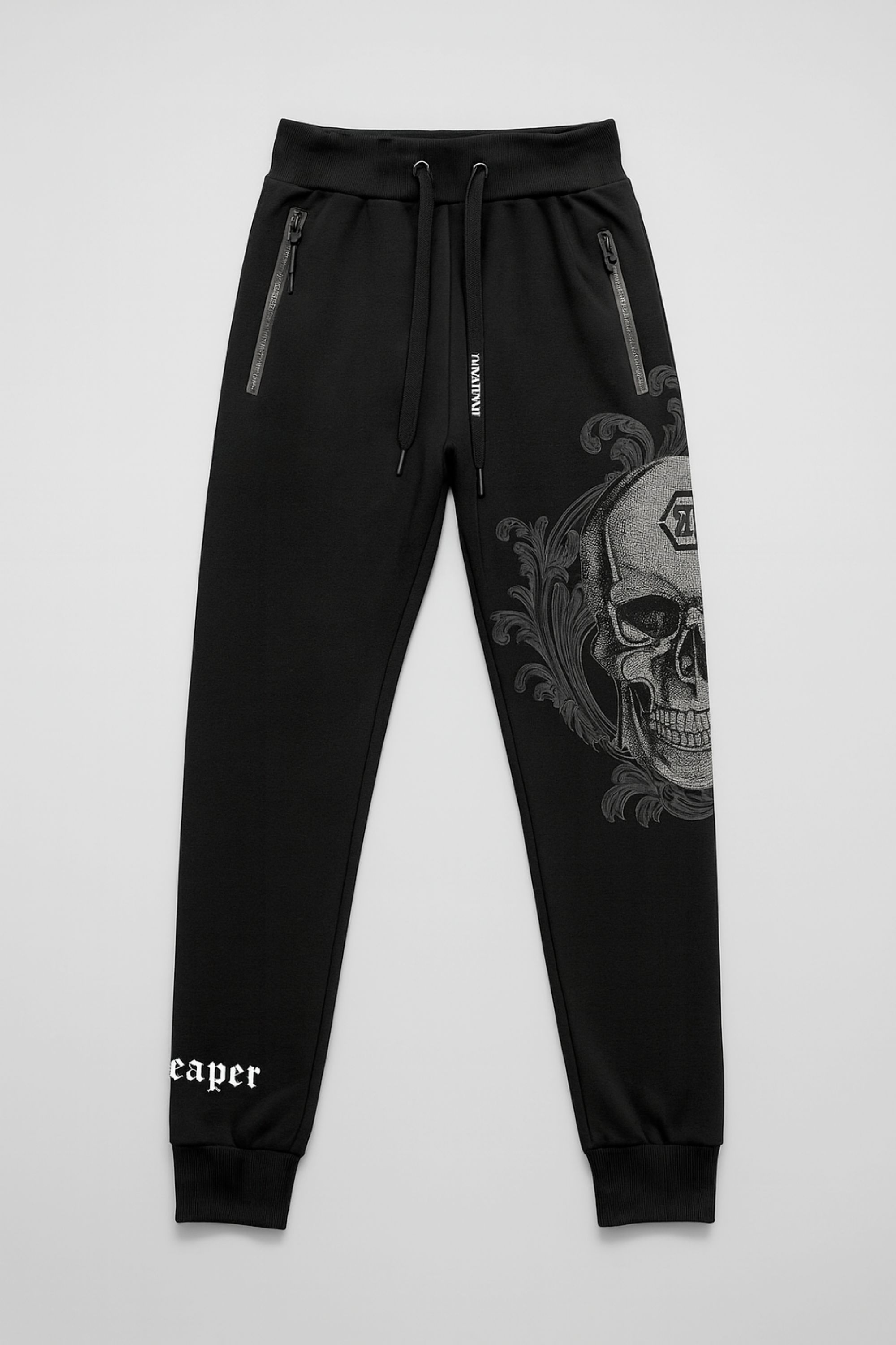 Pantaloni da uomo neri in felpa con decorazioni strass distintive. Sul lato della coscia, un teschio decorato con strass che continua sul retro. Stampa testuale su un polsino e cuciture decorative. Due tasche frontali con cerniera. Vita con fascia elastica e coulisse. Polsini elasticizzati.